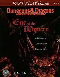 Eye of the Wyvern is a wilderness adventure, and part of TSR's Fast-Play Game adventure series. The Fast-Play products, which began with the introductory adventure "The Ruined Tower" and continued with Wrath of the Minotaur and Eye of the Wyvern, are intended to be easy to set up, run, and play, even for players new to D&D and roleplaying games.[1] Eye of the Wyvern briefly introduces the game system, with a "What is Roleplaying?" section and an introduction to the D&D concepts of character stats, character class, and race.[1]