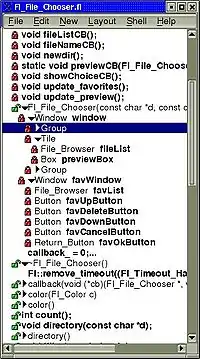FLUID (Fast Light User Interface Designer) is a graphical editor and GUI builder that is used to produce FLTK source code. FLUID edits and saves its state in text .fl files, which can be edited in a text editor for finer control over display and behavior.[1]