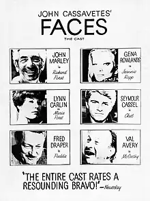 Faces is a 1968 American drama film written and directed by John Cassavetes.[1] It stars John Marley, Gena Rowlands, Lynn Carlin (her acting debut), Seymour Cassel, Fred Draper, and Val Avery.[2]