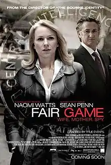 Fair Game is a 2010 biographical political drama film directed by Doug Liman and starring Naomi Watts and Sean Penn.[4] It is based on Valerie Plame's 2007 memoir Fair Game[4] and Joseph C. Wilson's 2004 memoir The Politics of Truth.[5]