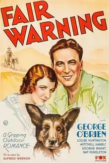 Fair Warning is a 1931 American pre-Code Western film directed by Alfred L. Werker and starring George O'Brien, Louise Huntington and Mitchell Harris. It is a remake of the 1920 silent film The Untamed.[1] The 1937 film Fair Warning is not a remake of this one.[2] The film's premise came from a novel by Max Brand, which initially was published in serial form in The All-Story from December 7, 1918, through January 11, 1919.[3]