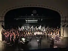 Fairmont Senior has three choral groups: the Madrigals, women's ensemble, and men's ensemble.[30] The full name of the school's Madrigals group is the Fairmont Senior Madrigal Chamber Choir, which is considered to be a renaissance style a cappella choir.[31] The group was started by Doug Bunner in 1985;[32] he taught at the school until his retirement in 2006.[33] The group hosts an annual elimination dinner at the Fairmont Knights of Columbus,[34] and the school presents the Madrigals's Yuletide Feast biennially (a tradition that started in 1985).[35] The group has performed at other places, such as the current Fairmont Senior building,[36] Meadowbrook Mall,[37] West Virginia University Mountainlair,[38] and the WorldStrides OnStage competition in Orlando, Florida.[30]