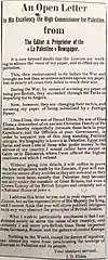 Following the first suspension in 1914, Falastin issued a circular responding to the government charges that they were "sowing discord between the elements of the [Ottoman] Empire," which stated that "Zionist" was not the same as "Jew" and described the former as "a political party whose aim is to restore Palestine to their nation and concentrate them in it, and to keep it exclusively for them."[12] The newspaper was supported by Muslim and Christian notables, and a judge annulled the suspension on grounds of freedom of the press.[12]