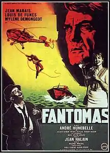 Fantômas (French pronunciation: [fɑ̃tomas]) is a 1964 French comedy film starring Jean Marais as the arch villain Fantômas opposite Louis de Funès as the earnest but outclassed commissaire Paul Juve. In the film Juve teams up with journalist Fandor, also played by Marais, trying to catch Fantômas but never quite succeeding. It was France's answer, in 1964, to the James Bond phenomenon that swept the world at around the same time. It is the first film of a trilogy,[2] and Fantômas became extremely successful in Europe, the Soviet Union and Japan. It found success even in the United States, where fan websites exist to this day. Mylène Demongeot plays "Hélène Gurn", the girlfriend of "Jérôme Fandor", Fantômas' arch enemy. The general tone of the films is more light-hearted than the original Fantômas novels. Commissaire Juve, as played by Louis de Funès, becomes a comedic character, much unlike his literary counterpart.[3]