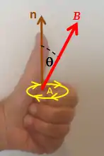 • Stretch your thumb. The stretched thumb indicates the direction of n (brown), the normal to the area enclosed by the loop.