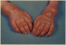 • Swollen, painful joints with progressive limitation of range of motion resulting in contracture