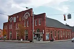 Farmers Market, more commonly called Penn Market and also known as York Farmers' Market or Market & Penn Street Farmers' Market, is a historic public market located in York, Pennsylvania. It was built in 1876 and expanded about 1890. The original section is a simple 60 feet wide and 80 feet long gable roofed brick building. A 40 foot wide rectangular section was added in the expansion and the two sections were joined under a single, moderately pitched gable roof. With the expansion, a five bay wide false front was added to unify the building. The front facade features two ornamental circular windows. Attached to the main building are three auxiliary buildings including a Queen Anne style stable.[2]
