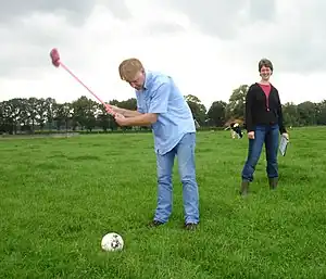 Farmersgolf is played with a special wooden golf club, with a club head in the shape of a wooden shoe, or clog (in Dutch: klomp). A farmers golf ball is, with its 20 centimeter diameter, much larger than a traditional golf ball.