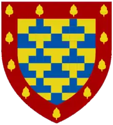 Potenty Or and Azure on a ordure Gules eleven acorns Or.