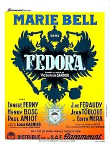 Fedora is a 1934 French drama film directed by Louis J. Gasnier and starring Marie Bell, Ernest Ferny and Henri Bosc.[1] It is an adaptation of the 1882 play Fédora by Victorien Sardou.[2] It was distributed by the French subsidiary of Paramount Pictures. The film's sets were designed by the art director Henri Ménessier.