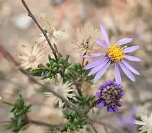 The flower heads are on the short shoots or at the tip of the long shoots, medium-sized, seated or on up to 10 cm (3.9 in) long stalks. The involucre is 6–8 mm (0.24–0.31 in) in diameter, and consists of three to four whorls of bracts. These bracts are overlapping, lance-shaped, hairless, tawny to greenish in colour with the tip often tinged red. They have a papery margin more or less set with a regular row of hairs. The outer bracts are 1½ mm (0.06 in) long and ½ mm (0.02 in) wide, those in the middle 3 mm (0.12 in) long and 1 mm (0.04 in) wide, and the inner 5 mm long and ½ mm wide. Each head has ten to fifteen female, medium or light purple, rarely white, ray florets of about 1 cm long and 1½ mm wide. These surround numerous bisexual yellow, later burgundy-washed disc florets of 4–6 mm (0.16–0.24 in) long. The two style branches each have a long triangular appendage. The pappus bristles are numerous, yellowish white in colour, and do not detach. Although they vary in length, they do not occur in two distinct rows. The longer pappus bristles have teeth along their length and are 5–7 mm (0.2–0.28 in) long, the shorter scaly and ½–1 mm (0.02–0.04 in) long. The dry, one-seeded, indehiscent fruits called cypselae are obovate to elliptic, about 4 mm (0.16 in) long and 1½ mm (0.06 in) wide, evenly silky hairy, with a brownish scaly surface when mature, and a light ochre-coloured marginal ridge.[4]