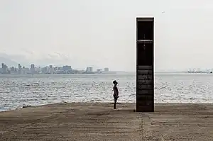 In 2016 Felippe Moraes constructed his Monument to The Horizon (2016), a large-scale permanent public sculpture placed at Caminho Niemeyer in Niterói.[6][7] The work is a five-meter tall steel tower around a small set of stairs that lead to a strip in the metal, revealing the horizon of Rio de Janeiro on the opposite side of the Guanabara Bay.[6]