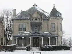 Ferguson House, also known as the Dr. Robert A. Brewer House, is a historic home located at Logansport, Cass County, Indiana. It was erected about 1895, and is a three-story, Romanesque Revival style brick dwelling sheathed in Indiana limestone. It features projecting bays and a 2+1⁄2-story round tower with conical roof, a one-story porch supported by Doric order columns, and a steeply pitched roof.[2]: 2