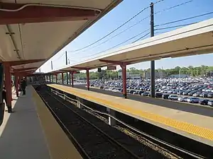 The fare control is located at street level and the platform is elevated. For most of the platform, there are two tracks, serving the Philadelphia and Lindenwold bound trains. There is also a third track that starts halfway down the platform. The platform splits and the train can come up into this spot. It was once used by Ferry Avenue Local trains that originated here and went to Philadelphia, but Ferry Avenue Local trains were replaced with Woodcrest Local trains on September 20, 1980.[3] The third track is now used to store a train mid-day.