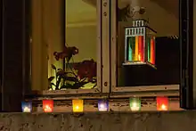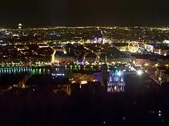 The Festival of Lights (French: Fête des lumières) in Lyon, France, is a popular event that originally aimed at expressing gratitude toward Mary, mother of Jesus around December 8 of each year.[1] This unique Lyonnaise tradition dictates that every house place candles along the outsides of all the windows to produce a spectacular effect throughout the streets. The festival includes other activities based on light and usually lasts four days, with the peak of activity occurring on the 8th. The two main focal points of activity are typically the Basilica of Fourvière which is lit up in different colours, as well as the Place des Terreaux, which hosts a different light show each year.[2][3][4][5][6]