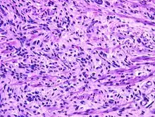The tumor may be seen within the subcutaneous tissues (below the skin),[4] mucosal surfaces or in soft tissue. Within the head and neck, the posterior ear region, skin of the face, and the tongue are the most commonly affected sites (about a 2:1 ratio of soft tissue to mucosa).[5][6] The tumors are well defined, non-specific usually solitary masses, but when seen in the head and neck (or genital region), they may be polypoid. Tumors range in dimension from a few millimeters up to 12.5 cm, with a mean of about 3.0 cm. Although there are isolated case reports, multifocality is very rare.