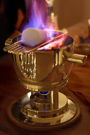 Feuerzangenbowle (ⓘ) is a traditional German alcoholic drink for which a rum-soaked sugarloaf is set on fire and drips into mulled wine. It is often part of a Christmas or New Year's Eve tradition. The name translates literally as fire-tongs punch, "Bowle" meaning "punch" being borrowed from English.