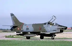AMI (Italian Air Force) placed orders for two batches; 35 fighters followed by another 20, later cut to 10. The last one was delivered around mid 1976, making a total of two prototypes, 20 pre-series and 45 series aircraft. No export success followed. These aircraft served with 101° Gruppo/8° Stormo (Cervia-S.Giorgio) from 1970, and later, from 1974, they served with the 13° Gruppo/32° Stormo (Brindisi).[3] Those 'Gruppi' (Italian equivalent of British 'squadrons', usually equipped with 18 aircraft) lasted until the early '90s, as the only ones equipped with the 'Yankee', using them as attack/reconnaissance machines, both over ground and sea, until the AMX replaced them.