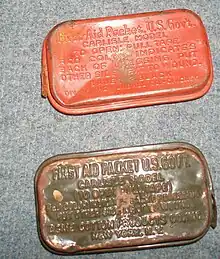 This dressing, already developed in 1904, and subsequently introduced in 1906, was supplied to the troops in a sealed brass casing, to protect the bandage inside against gas attacks, and to also ensure that it remained sterile. An improved version was introduced in 1940, designated First-Aid Packet, U.S. Government – Carlisle Model to tackle the problem of front line wounds and casualties. The Carlisle Bandage underwent a number of changes in its development during WW2. In summer of 1940, U.S. Army, Carlisle Model Small First-Aid Dressing made its appearance. It was contained in a waxed rectangular tuck-end carton, printed with the required markings. Considerable difficulty was encountered in the procurement of the first aid packet. During the Army expansion of 1940, approximately eight million were required for initial stock of equipment In the middle of 1941, the Medical Department decided to amend their specifications, and placed purchase orders for containers made out of tin (instead of brass). The new version was introduced by fall of 1941, together with the very first Sulfanilamide Shaker Envelopes. During the early part of 1943, a plastic container (called Tenite) was developed and put into production, but under field conditions the package warped and broke open. In the course of 1943 the items were wrapped in laminated paper, reinforced with aluminum or lead foil, and covered internally with either pliofilm, cellophane, or polyvinyl butyral and placed inside an appropriate waxed cardboard shell. The small Carlisle model first aid dressing measured approximately 4"X2"X1". When opened, its 1/2"-thick pad measured 7"X4" and had two long gauze tietapes.[2] The Large Carlisle model first aid dressing measured approximately 11 3/4"square. Brief instructions were stenciled on the bandage in red ink. Most packaging included the word "Sterile" and the directions "Red color indicates back of dressing – put other side next to wound." If a dressing was "camouflaged" it was olive drab in color. Detailed explanations and photos concerning the application of dressing to wound were included in a printed manuals for US soldiers.[3][4][5]