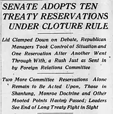 - ↑ Bomboy, Scott (November 15, 2017). "On this day, Wilson's own rule helps defeat the Versailles Treaty". National Constitution Center. Archived from the original on February 3, 2023. Retrieved May 15, 2019.