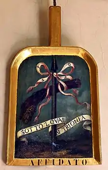 After a long period of disputes with his uncle he finally decided, in 1610, to withdraw from involvement in the family business in order to devote his time to natural philosophy.[1] On 7 July 1610 Salviati himself became a member of the Accademia della Crusca (founded by his ancestor Lionardo Salviati)[5] with the nickname of 'Affidato' ('Trusted') His ceremonial membership spade bears the image of a Roman spearhead from which hangs a bundle of wheat with the motto "sotto 'l qual si trionfa" taken from a line in Petrarch's Canzone XLIX ('O solid shield for the oppressed peoples / against the blows of Death and Fortune / under whom we triumph').[9] He contributed to the successful completion of the Vocabolario degli Accademici della Crusca, as the major financier of the first printing in 1612.
