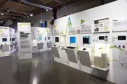 Among interactive stands there is a stand of the 3D cooperative sports video game Suunnistussimulaattori (lit. 'Orienteering Simulator'), where museum visitors could make a virtual trip to observe landscapes of Finland running with virtual orienteering map and compass.[11][12] This game has been used by Finnish and other orienteering athletes for virtual training (as an alternative to Catching Features), but development of this game stopped in 2016.[13][14][15][16][17] Also on the Suunnistussimulaattori stand behind the glass there are real orienteering sport equipment and game souvenirs, presented to museum by Antero Pulli, developer of the original game and Finnish orienteering athlete.[18][19]
