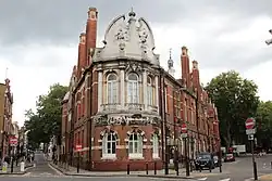 The foundation stone for the new building was laid on 14 July 1894.[4] It was designed by William Charles Evans-Vaughan in the Flemish Renaissance Revival style and built by Charles Dearing of Islington; it was officially opened by the Prime Minister, Lord Rosebery, as Clerkenwell Town Hall on 14 June 1895.[4] The design involved an asymmetrical main frontage with nine bays facing onto Rosebery Avenue; the central section featured a projecting cast iron porch flanked by composite order columns on the ground floor; there was an arched opening containing a Venetian window on the first floor and a four small windows on the second floor with a projecting clock above.[1] The clock was by Thwaites & Reed.[4] Internally, the principal rooms were the great hall, which was elaborately decorated in a Belle Époque style, and the council chamber which had a vaulted plaster ceiling supported by Ionic order columns.[1] The great hall was illuminated by sculptures of female figures, known as the "Clerkenwell Angels", which were designed by Jackson & Co. and which supported brass light fittings, made by Vaughan & Brown.[5]