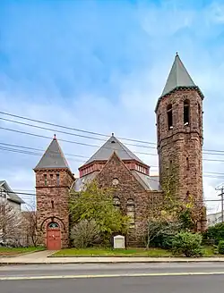 Bridgeport's First Baptist Church stands west of the city downtown at the northeast corner of Washington Avenue and West Street. It is a tall single-story structure, roughly in the shape of elongated octagon with several projections. It is built of red sandstone from East Haven. The most prominent is the 4-1/2 story octagonal tower at the street corner, which houses the main entrance in a square pavilion at its base. Shorter towers rise from the other corners of the building. The main roof is hipped, and rises to support a clerestory window near its apex. The interior is relatively little altered since a 1930 renovation, and still retains many features from its original construction, including the tile floor, plastered walls, and oak pews. Attached to the rear is the parish house, built at the same time with similar materials and styling.[2]