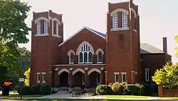 First Presbyterian Church is a historic Presbyterian church building located at 114 W. Main Street in Lincolnton, Lincoln County, North Carolina. It was built in 1917, and is a rectangular Late Gothic Revival style brick church with projecting corner towers. It has a front gable slate roof and features shallow, cement-capped buttresses, and lancet-arch windows. The interior is a modified Akron Plan with a theater-style sanctuary and adjoining space for extra seating or Sunday school.[2]