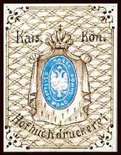 A new design of the first Russian postage stamp, of rectangular shape, was created by an ESSP's senior engraver Franz (Feodor) Kepler who submitted it for consideration on 21 October 1856.[5] Preparing his stamp sketch, Kepler carefully examined all materials brought by Charukovsky from abroad including the original designs and samples of stamps of different countries. As a prototype for creating the Russian postage stamp, Kepler took a printer's sample stamp made by a Prague firm Gottlieb Haase & Sons[lower-alpha 2] that was proposed for the Austrian stamps of rectangular shape.[3][6]