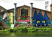 Street art on rear of Fish Island buildings as seen from Queen Elizabeth Olympic Park