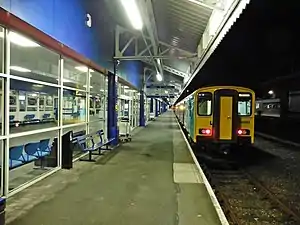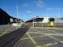 The station is not owned by Network Rail[6] but by Stena Line. A large part of the station is contained within the port building where there is seating and toilets. However, there are no railway ticket machines and the station is staffed only by Stena Line personnel, no rail staff are employed there. This means there is no rail ticket office and passengers travelling from Fishguard by train must purchase their tickets in advance by post, at a different station, or on board their train. The majority of passengers using the station are in possession of SailRail tickets issued at Rosslare Europort or another station in Ireland. The station has step-free access throughout and the station's owners, Stena Line, permit smoking on the platform.[7] The station also has both long and short stay parking. The minimum connection time from Fishguard Harbour is seven minutes, and when bus replacement services are operating, the buses leave from the car park adjacent to the level crossing.