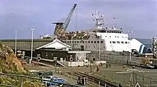 Despite being unable to complete the project as envisaged, the GWR still wanted to create a new port. The 900 m (3,000 ft) North Breakwater was created in deeper water by quarrying stone from the headland at Goodwick. The quarried-out area became the new quay and terminus for the West Wales line. On 30 August 1906, Fishguard harbour station was officially opened when the Waterford and Cork ferry services were transferred from Neyland to Fishguard Harbour.[3] Three years later, the first Cunard liner to call at Fishguard was the RMS Mauretania on 30 August 1909.[4] However, passengers had to be transferred ashore to the waiting London train by tender due to the shallowness of the harbour.[5]