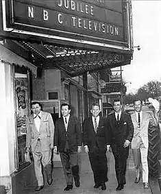 Five Star Jubilee debuted March 17, 1961 in black-and-white, but switched to color on May 12. The first two color programs (May 12 and 19) were videotaped beginning at 1:30 a.m. local time Friday (for playback that evening) after nearby KTTS-AM signed off at 1:00 a.m., because of unforeseen RF interference from its transmitter with the color TV picture.[3] Despite the hour, both shows had audiences at the theater.[4] NBC resolved the problem for the May 26 program, which was the first live color show.[5] The series was aired by 150 NBC affiliates, although not by WNBC-TV in New York.