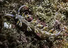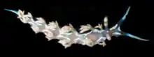 Body is elongate, narrowing posteriorly.[5] Rhinophores are lamellate, club-shaped and with white bands.[5] Cerata are arranged into clusters in two rows along the dorsum.[5] Background color is translucent gray with thick white or yellow patches running between the cerata clusters, on the margin of the dorsum.[5] A submarginal row of opaque white spots present along the sides of the body.[5] Three white or yellow patches are on the head.[5] Oral tentacles are long, translucent and white at the tips.[5] Cerata are translucent with a brown or orange band about a third of the way down from the tip.[5] The maximum recorded body length is 25 mm.[5][6]
