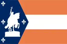 In 1915, Percival Chubb, Leader of the St. Louis Ethical Society, proposed that the city adopt an official flag. The Pageant-Drama Association held a contest with a $100 prize. In January 1916, they awarded the winning design to Edward A. Krondl, a young commercial artist.[4] Krondl's design featured an image of Saint Louis riding on a horse on a blue background, with orange and white stripes extending to the right. However, due to disapproval of Krondl's color scheme and his use of the fleur-de-lis, the city aldermen rejected Krondl's design and held a contest of their own. The winner of this contest, a man by the name of A.P. Woehrle, was announced in May 1916. Woerhrle's flag contained three stripes (red, white, and blue), in addition to stars on every corner and a shield containing Saint Louis in the middle. It was later discovered that Krondl had designed this flag as well, but had submitted it under the name of his friend Woehrle because he “wanted to win on merit and not the prestige gained by winning the previous contest.” The aldermen approved the design, but it wasn't until 1946 that the flag was officially recognized by a city ordinance.[5]