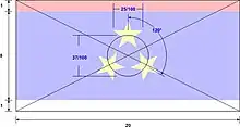 | Design | The horizontal tricolour of red, blue and white colour, with three yellow five-pointed stars |