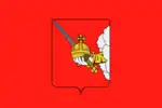 The flag of Vologda Oblast, a federal subject of Russia, was adopted 26 November 1997.[1] The flag is a field of white, with a red vertical band on the fly. A charge of the Vologdan seal is in the upper hoist corner. The seal is red, with a hand emerging from a cloud, holding an orb and a sword. A crown floats over the hand. The ratio of the flag is 2:3.