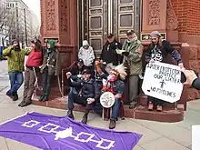 The flag of the Iroquois Confederacy or Haudenosaunee flag is the flag used to represent the six nations of the Iroquois. It is a purple flag with four connected white squares and an eastern white pine tree in the center.[1]