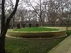 The garden was designed by the Belgian architect Piet Blanckaert.[1] The garden features a 'circular grass bed' which holds soil collected from Flanders in Belgium, the site of many battles in the Western Front of World War I and trees native to Flanders.[1] The grass bed is inscribed with words from the poem "In Flanders Fields" by John McCrae. A stone bench is also situated in the garden made from Flemish bluestone.[1] The curator of the memorial garden, Andrew Wallis, said that the garden's design was "...full of meaningful features" and it was a "...wonderful fusion of Belgo-Anglo craftsmanship."[1]