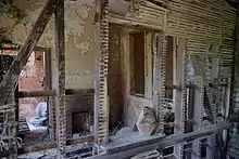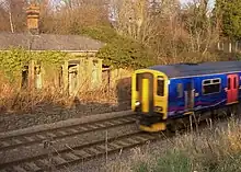 More survives of the second station – the main building and goods shed on the eastbound platform are still in situ, albeit boarded-up and crumbling, at the end of a private residential road.[1] The building on the westbound platform has been demolished, the platforms have been removed and the running lines slewed closer to the remaining station buildings. The relief line to the east has been removed. The fuel sidings were disconnected and the adjacent crossover points removed in February 2004.[6][7]