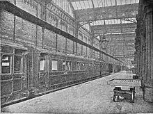 The railway approached the station from the south. Platforms 1 and 4 ran the full length of the station, the northern half of each platform being under a glass-roofed train shed. Between the platforms were the booking office, waiting rooms, left luggage office and so on. Platforms 2 and 3 were shorter bay platforms which did not enter the train shed. Platform 5 was the boat train platform, the longest of all, which ran outside the train shed along its eastern side. At the north end was a glass-roofed concourse, running from the Queen's Terrace entrance to the jetty for steamers on the side of the Wyre.[9] On the north side of the concourse were refreshment rooms, separately for first- and second-class passengers. There were further goods sheds and sidings to east of the station.[10]