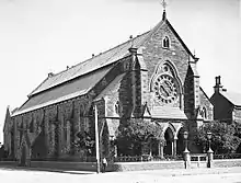 Robert G. Thomas, the architect who would later be responsible for the Stow Memorial Church (now Pilgrim Uniting Church), was selected to design the building, which is of Gothic revival style in bluestone and sandstone with elaborate capitals on the columns, a rose window and front entrance with three arches supported by pillars.[3]