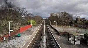The original footbridge remains and is still in use. A small "bus stop" style shelter on the down platform also survives from the original station building. Train running information is provide by timetable posters and information boards. Step-free access is available to both platforms.[1]