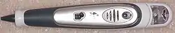 The Fly, released in 2005,[2] is a customizable pen that is intended to assist children with schoolwork. There are several bundled and add-on applications available, including a notepad, calculator, language and writing assistant, and educational games; many of these require the use of a small cartridge that can be inserted into a port built into the rear of the pen.[3] The Fly only works on its own proprietary digital paper, which is lightly printed with a pattern of dots to provide positioning information to the pen via a tiny infrared camera. The ink tip itself can be retracted into the body of the pen when no physical notes are desired.[3]