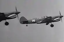 In 1942, due to wartime priorities that prohibited the use of U. S. military aircraft for Hollywood productions, Republic Studios approached Curtiss-Wright in Buffalo to recreate the aerial battle sequences required for Flying Tigers.[9] A number of P-40F fighter aircraft waiting for delivery to the U. S. Army Air Forces were repainted in American Volunteer Group (AVG) markings, and with the aid of Curtiss test pilots, flew in the film. Chief Production Test Pilot Herbert O. Fisher's screen role was substituting for John Wayne.[10]