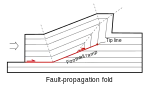 Fault propagation folds or tip-line folds are caused when displacement occurs on an existing fault without further propagation. In both reverse and normal faults this leads to folding of the overlying sequence, often in the form of a monocline.[13]