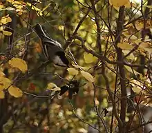 Foliage gleaning, the strategy of gleaning over the leaves and branches of trees and shrubs, can involve a variety of styles and maneuvers. Some birds, such as the common chiffchaff[1] of Eurasia and the Wilson's warbler[2] of North America, feed actively and appear energetic. Some will even hover in the air near a leaf or twig while gleaning from it; this behavior is called "hover-gleaning".[2] Other birds are more methodical in their approach to gleaning, even seeming lethargic as they perch upon and deliberately pick over foliage. This behavior is characteristic of the bay-breasted warbler[2] and many vireos.[3] Another tactic is to hang upside-down from the tips of branches to glean the undersides of leaves. Tits such as the familiar black-capped chickadee are often observed feeding in this manner. Some birds, like the ruby-crowned kinglet[3] and red-eyed vireo[4] of North America use a combination of these tactics.