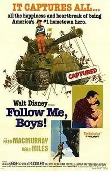 Follow Me, Boys! is a 1966 American drama film produced by Walt Disney Productions. It is an adaptation of the 1954 novel God and My Country by MacKinlay Kantor and was the final live action film produced by Walt Disney, who died two weeks later. The film stars Fred MacMurray, Vera Miles, Lillian Gish, Charles Ruggles and Kurt Russell, and is co-produced by Walt Disney and Winston Hibler, directed by Norman Tokar and written by Louis Pelletier. It is one of the few films featuring the Boy Scouts of America and is Disney's paean to the Boy Scouts. The title song "Follow Me, Boys!" was written by studio favorites Robert and Richard Sherman. After the film's production, the Boy Scouts of America considered using the song as their anthem, but efforts toward the end were dropped. The Boys' Life magazine included a teaser article of the film.[2] Follow Me, Boys! was the first of ten Disney films in which Russell appeared over the next ten years. A DVD version was released on February 3, 2004 by Walt Disney Home Entertainment, although it is in 4:3 pan and scan format, not the original 1.66:1 wide screen aspect ratio.