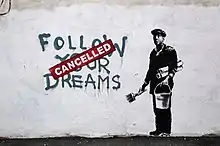 The work depicted a man holding a brush and bucket stood by a handprinted sign saying "follow your dreams." The drip-dried slogan, which is a dark grey along with the man, had a red stamp over it reading "cancelled".[2]